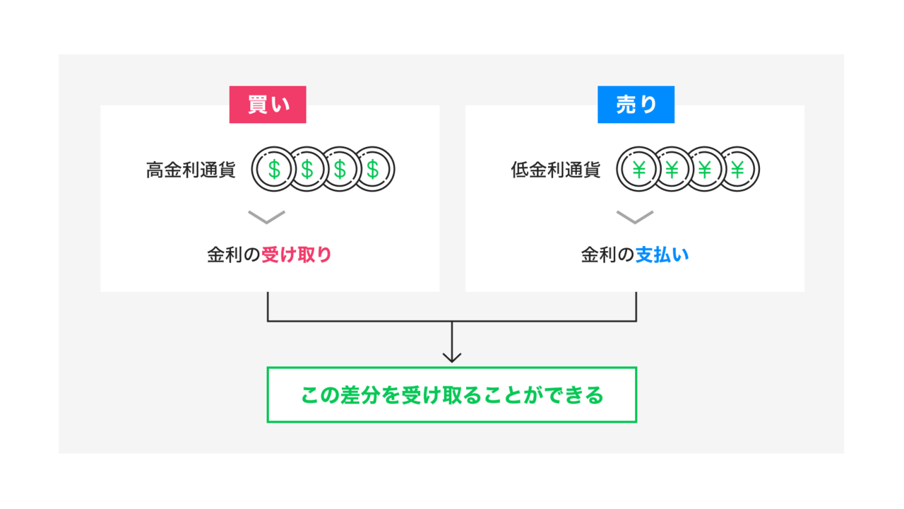 FXでは、ある通貨を買い、もう一方の通貨を売ることが基本になりますが、この時にそれぞれの通貨ごとに金利が発生しています。これは、「買った通貨の金利を受け取る」、「売った通貨の金利を支払う」ことになります。