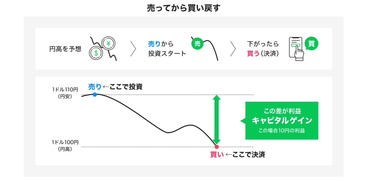 為替レートは日々変動している為、「買った時よりも高いところで売り」、または「売った時よりも低いところで買い戻す」などといった取引をして収益を得る事ができます。