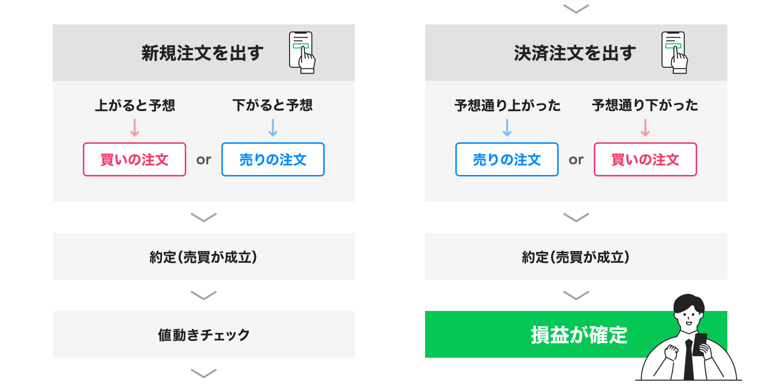 決済注文は取引を終えるための注文です。新規注文をしたら、そのポジション(建玉)を決済することで取引を終えます。