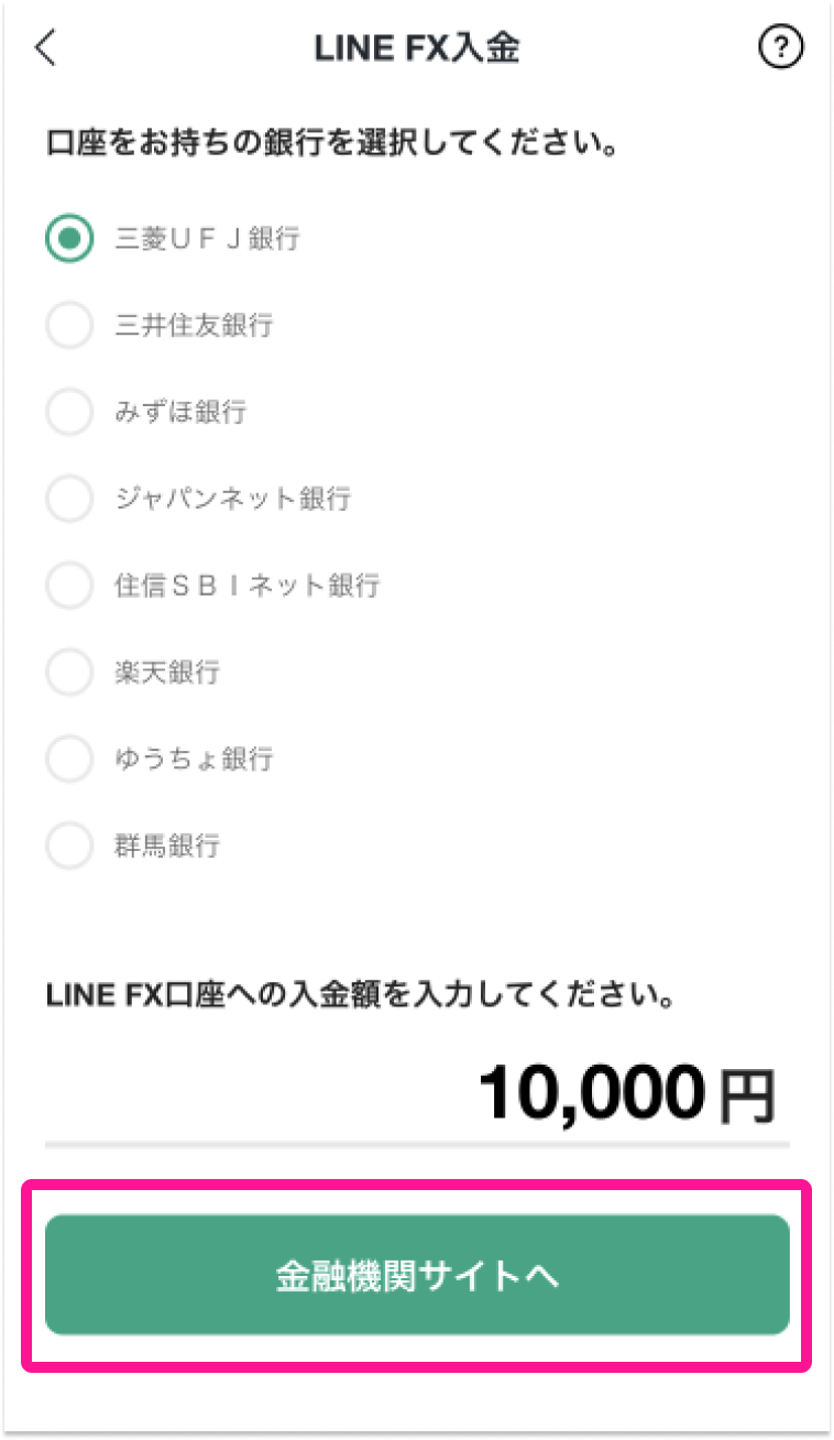 3)金融機関を選択>金額を入力>「金融機関サイトへ」をタップ