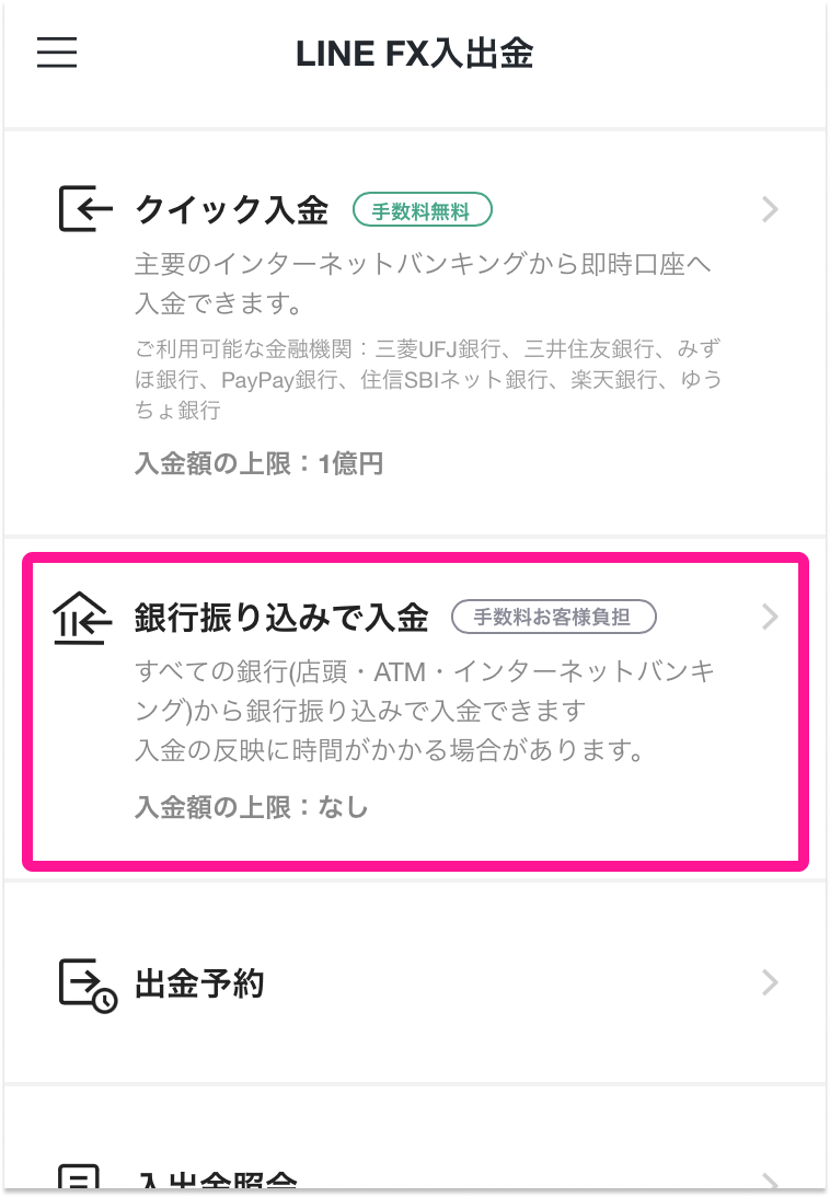 LINE FX口座と異なる名義の口座からはご入金いただけません。