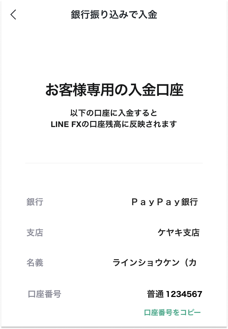- お客さまごとに「お客様専用の入金口座」をご用意しております。ご自身の銀行口座から、表示されている入金口座に銀行振り込みを実施することで、LINE FXの口座残高に反映されます。