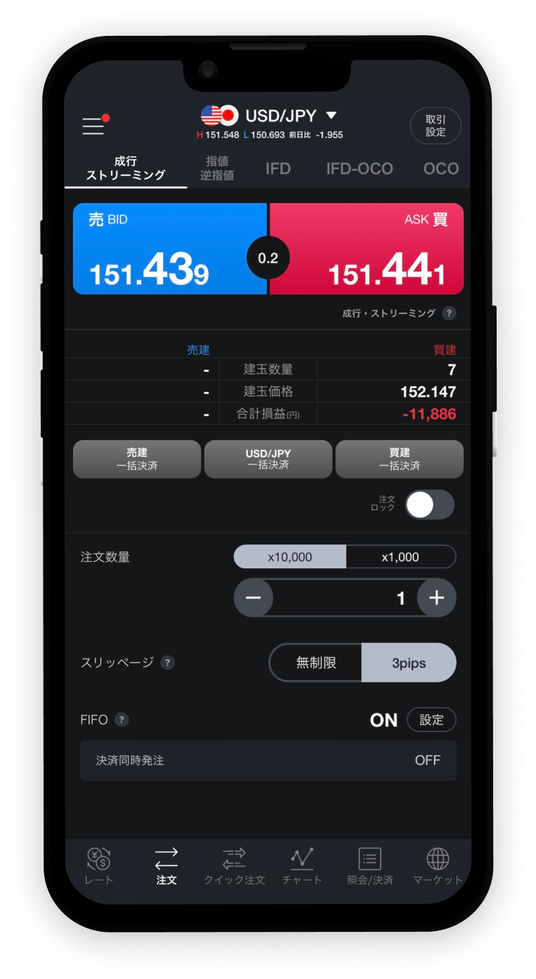 チャートを確認しながらワンタップで注文でき、シンプルでスピーディな取引が可能。チャートストリーミング画面は、縦画面・横画面表示に対応しています。4チャート表示への切替えや、表示する通貨ペア、表示期間の切替、チャートへのライン描写もスムーズに行えます。