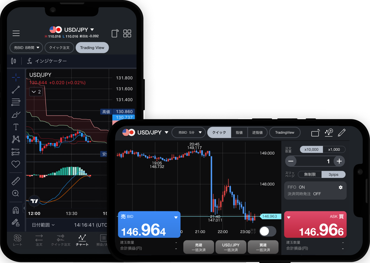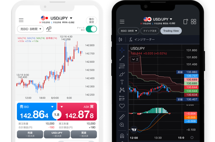 チャートを確認しながらワンタップで注文でき、シンプルでスピーディな取引が可能。 背景は好みに合わせて、ダークテーマとライトテーマが選べます。