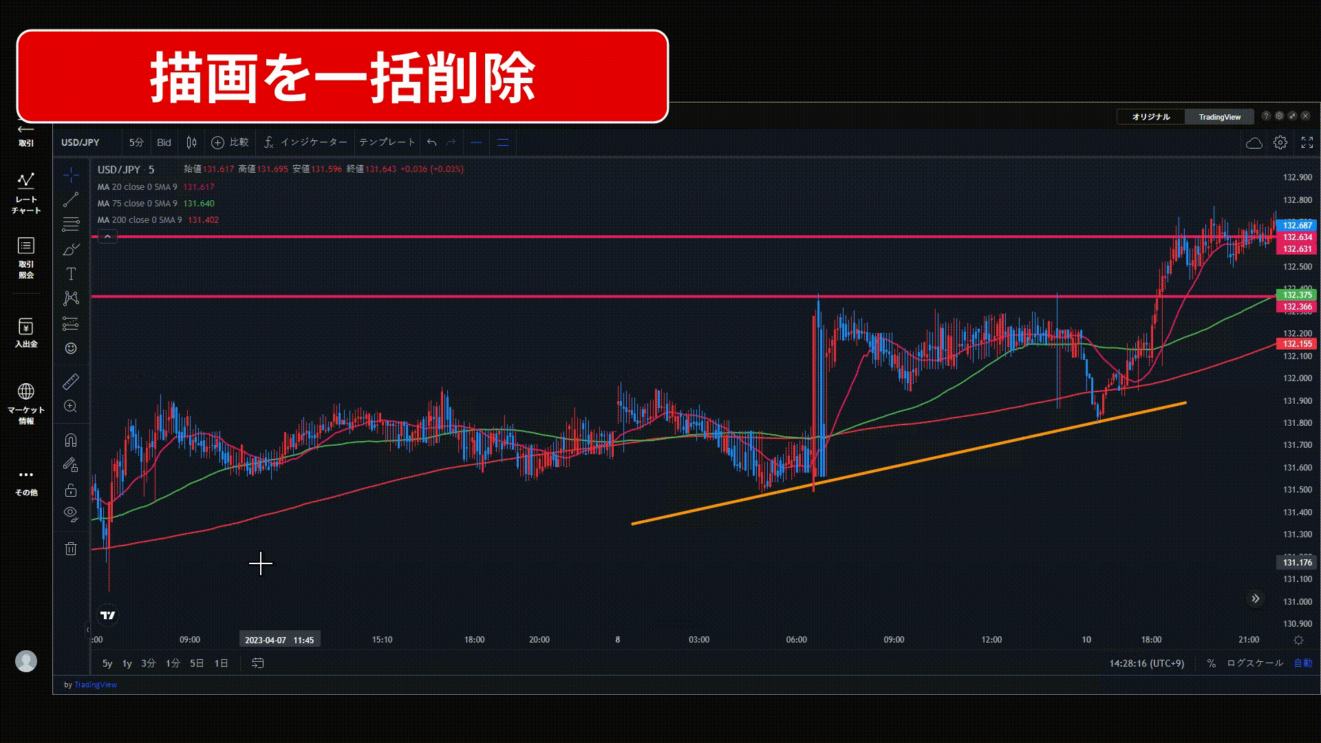 トレード前の準備・分析 2024年6月4日 一覧に戻る 表示中のインジケーターやツールをまとめて削除する すべてのインジケーターや描画ツールをまとめて削除したい場合は、左側メニューのゴミ箱アイコンから削除できます。 次ページ:現在のレートで注文する(成行注文) 一覧に戻る 1234