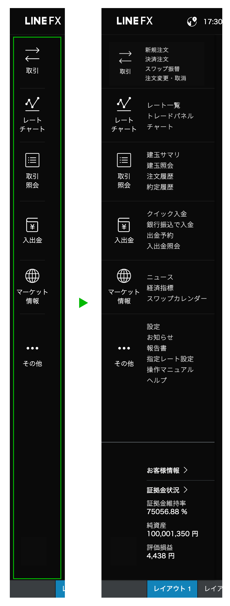 画面の配色、一覧系画面での表示項目、注文時の初期設定など、LINE FX Proを利用する上での各種設定を行うことができます。