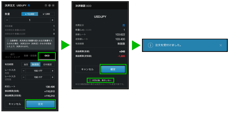 チェックをONにして省略した場合、決済注文中の建玉決済を決済しない / 決済する(上記画像②の部分)については、今回の設定を次回以降も引き継ぎます。