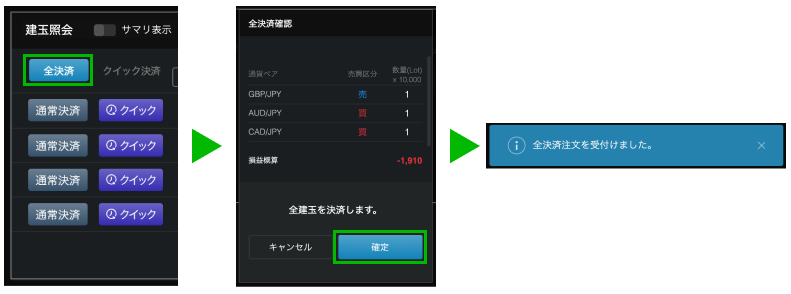 「全決済」ボタンをクリックすると、保持している建玉が全て成行決済されます。