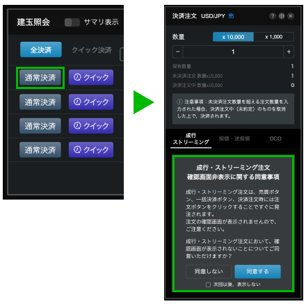 次回以降、クイック決済確認画面は省略され、決済注文中の建玉は決済されません
