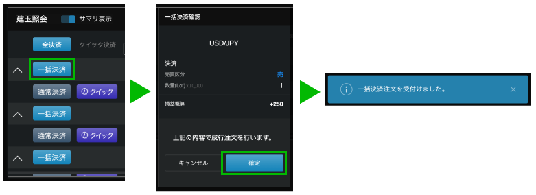 「⼀括決済」ボタンをクリックすると、同じ通貨ペアの同売買⽅向の建玉ごとに⼀括して成⾏決済されます。