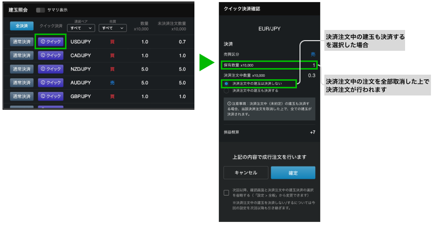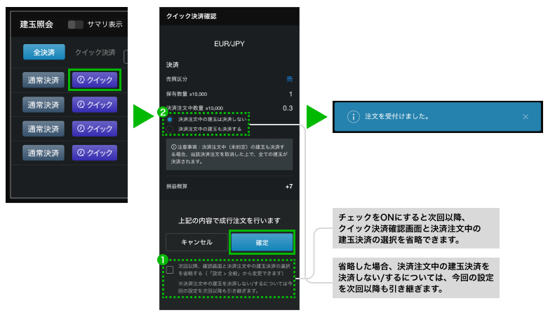 上記画像の①において、チェックをONにすることで次回以降、クイック決済確認画面と決済注文中の建玉決済の選択を省略できます。