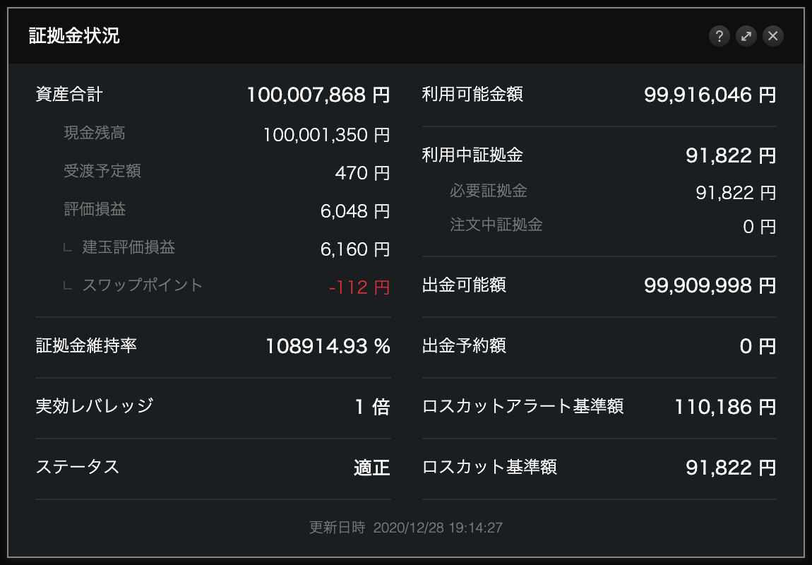 保有している建玉に対して証拠金(資産合計)がどの程度の割合かを表す数値です。ステータスやロスカットアラートやロスカットの判断の基準となる数値です。