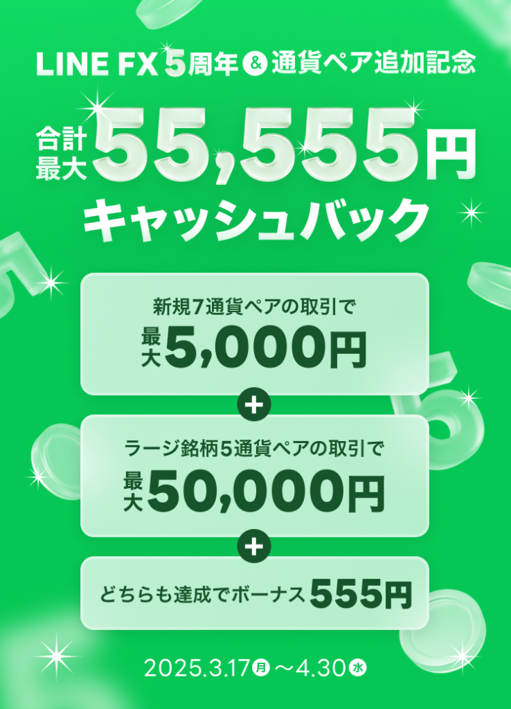 このたび、「LINE FX」のサービス提供開始から5周年を迎えるにあたり、更なるユーザーへの利便性向上を目指して通貨ペアとラージ銘柄を追加しました。また、ユーザーへの日頃の感謝の気持ちを込めて、「LINE FX 5周年&通貨ペア追加記念キャッシュバックキャンペーン」を2025年3月17日(月)から4月30日(水)まで開催し、新たに追加した通貨ペアとラージ銘柄を対象に、最大55,555円をキャッシュバックします。