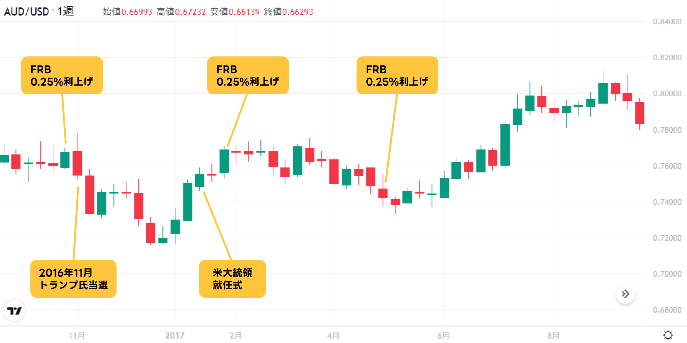 2016年10月~2017年9月のAUD/USDの週足チャート