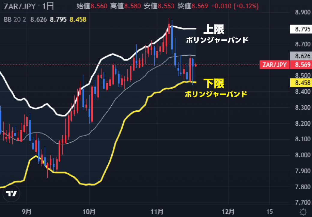 11月に入って9月からの上昇トレンドに対する調整の動きとなっているZAR/JPY。チャートのポイントでは、ボリンジャーバンド※の下限である8円45銭近辺でZAR/JPYの調整下落が限定されたことから、今後しばらくはボリンジャーバンド内での相場展開も想定される。