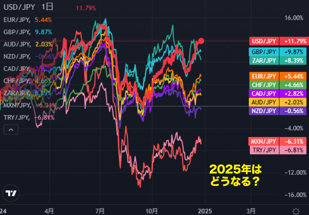 一方、高金利通貨ペアで知られるTRY/JPYとMXN/JPYは年間で約6%の下落となった。特に、メキシコに関しては、トランプ氏が再選を果たしたことで、メキシコ経済への影響が懸念されている。既に、トランプ氏はメキシコからの輸入品に対して関税を引き上げると発言しており、2025年も今年の流れを引き継いでMXN安が更に進む可能性が注目される。