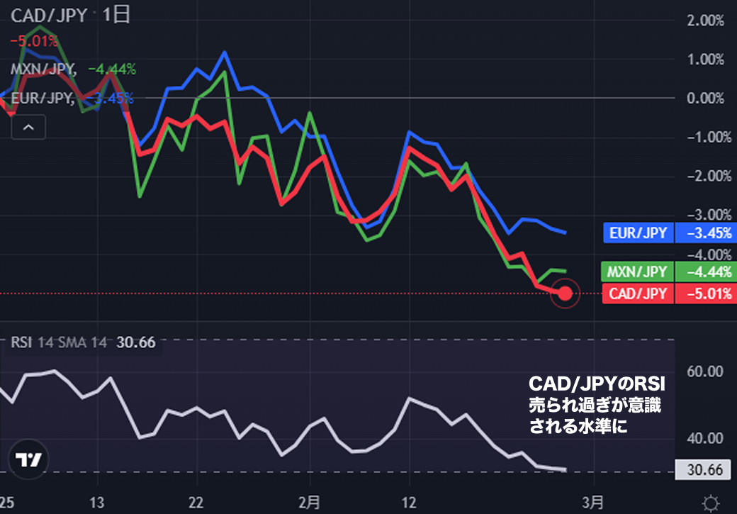 「先週何した?」とメール報告の件で米国政府職員の間で混乱が広がる中、昨日は、トランプ政権がEUからの輸入品に対して25%の関税を課すと表明した。このように、トランプ政権は米国内外を問わず揺さぶっており、その分、不確実性も増しつつある。その影響で、米国の株価は下落に反応など、リスク回避ムードも見え始めている様子。為替市場も同様に、トランプ関税の対象となったCAD, MXN, EURは、年初来から対JPYで3~5%下落し、リスク回避の円買いの動きも観測されている模様。