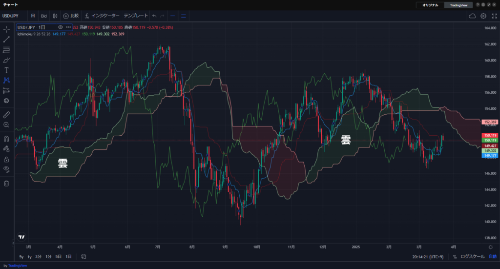 また、一目均衡表には、先行スパンA、先行スパンBで形成される「雲」と呼ばれる領域が特徴です。この雲は、26日先の価格帯を予測するもので、現在の価格が雲の上にあれば上昇トレンド、下にあれば下降トレンドと判断します。さらに、雲自体が支持線や抵抗線として機能するため、相場の強さの手がかりとなります。
