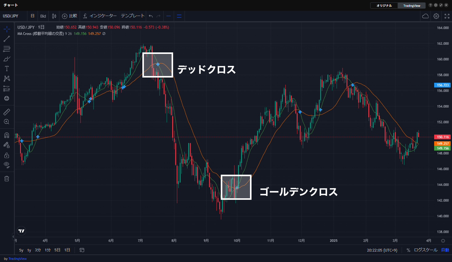 たとえば、短期(5日)と中期(25日)の移動平均線を利用する場合、短期線が中期線を上向きに突き抜ける「ゴールデンクロス」は買いシグナル、下向きに突き抜ける「デッドクロス」は売りシグナルとして認識されます。