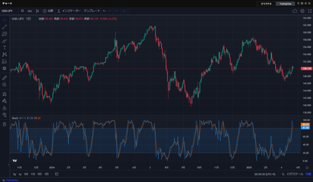 ストキャスティクスの特徴は、0から100までの範囲で相場の買われすぎ・売られすぎを判断できる点です。一般的に、80以上を過買い圏、20以下を過売り圏とみなします。