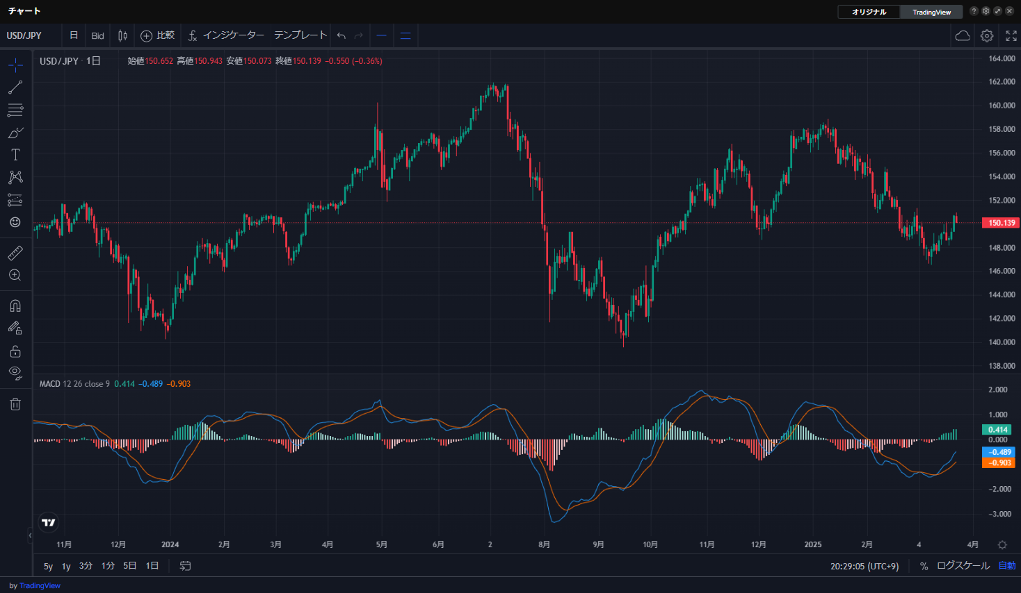 MACD(Moving Average Convergence Divergence:移動平均収束拡散法)は、短期と長期の2つの移動平均線の差を利用して、相場のトレンドやモメンタムを分析する指標です。MACD特有のヒストグラム表示により、売買のタイミングを視覚的に判断する際に役立ちます。