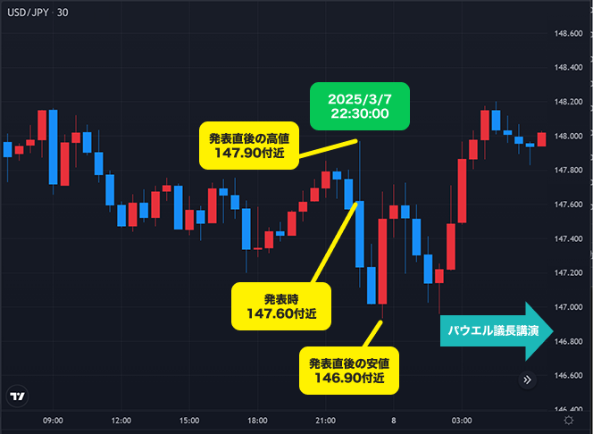 3月7日(金)発表の前回の米国雇用統計は、非農業部門雇用者数、失業率ともに市場予想をやや下回るなど、総じて弱めの結果となった。この内容を受け、発表直後のUSD/JPYは米国の景気後退への懸念から、一時146円台まで円高が進行。しかし、日本時間の深夜に行われたFRBパウエル議長の講演において「利下げを急ぐつもりはない」という主旨の発言が報じられると、一転して円売りが優勢に。USD/JPYは、雇用統計の発表当日としては比較的狭い値動きの中、148円ちょうど近辺で取引を終えた。