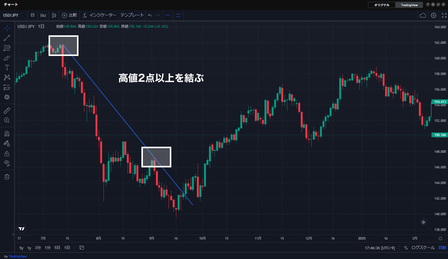 次に下降トレンドの場合は、高値と高値を2点以上結んでレジスタンスラインを引きます。以下の画像では、次のようにレジスタンスラインを引くことができます。