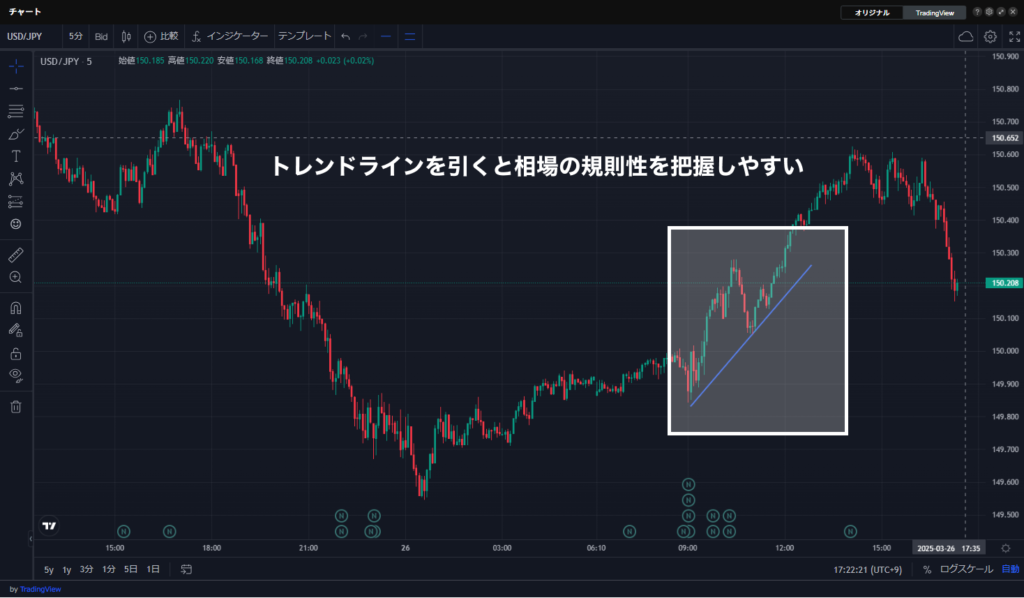 たとえば、デイトレーダーなら1時間足や15分足、スキャルピングなら5分足や1分足などとトレードスタイルに合わせてチャートを選び、トレンドラインを描いてみてください。