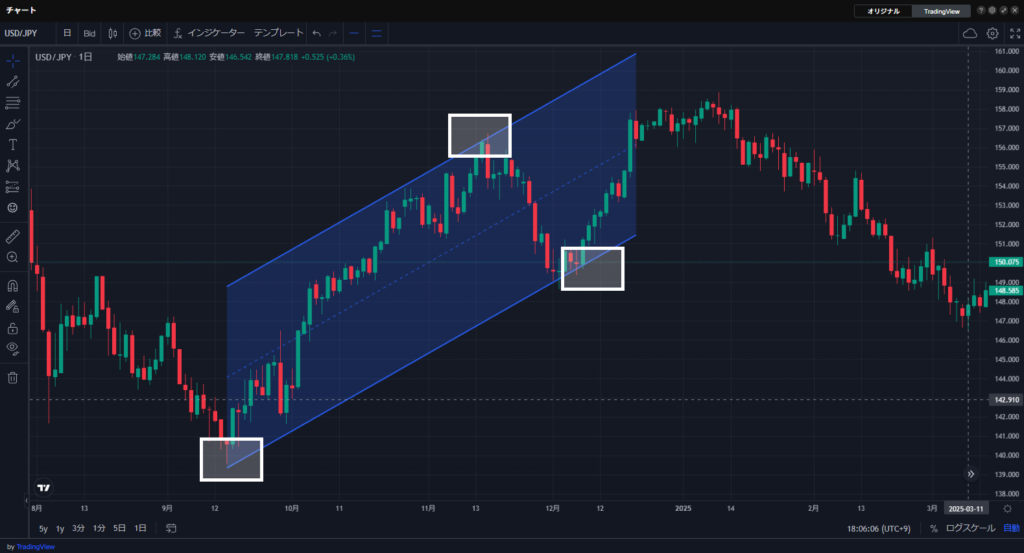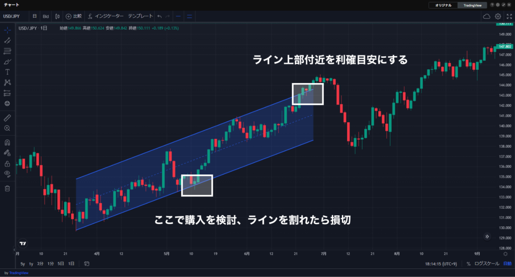 たとえば、以下の平行チャネルの場合、サポートラインを割ったら損切りを、レジスタンスラインを上に抜けたら利益確定を検討することができます。