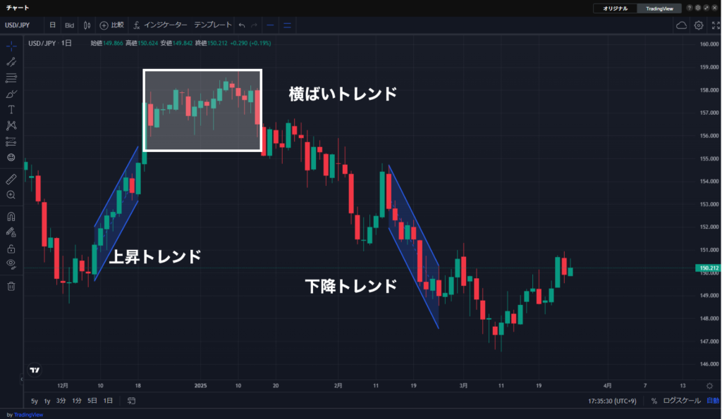 このうち横ばいトレンドでは売買の判断が難しいため、上昇トレンドと下降トレンドを見つけ、その方向性に沿って取引してみるとよいかもしれません。