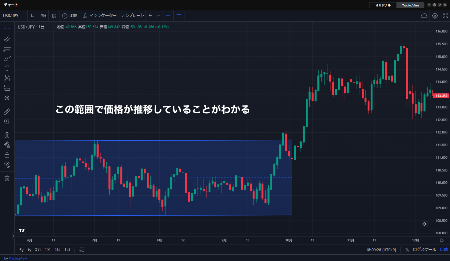 2本の線を引くことで、どの範囲で価格推移しているのかが分かりやすくなります。そしてサポートラインとレジスタンスラインのどちらかを突破した場合、上昇トレンドや下降トレンドが発生する可能性があるため、新たに新規注文するポイントを探す際の判断材料にもなるでしょう。