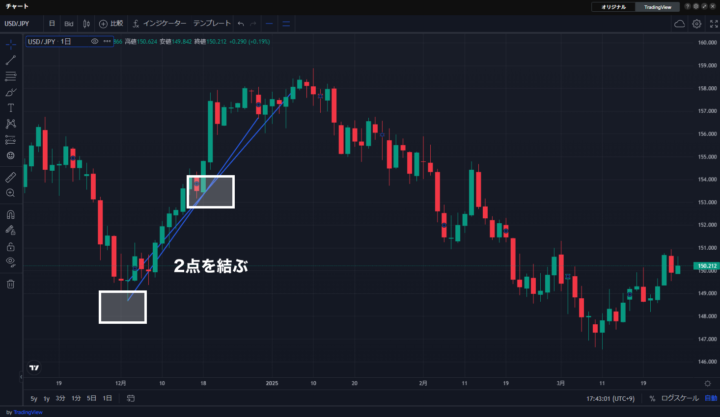 たとえば以下の画像では、次のようにトレンドラインを引くことができます。