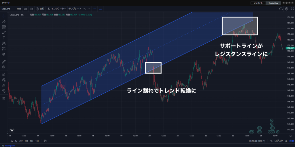 たとえば以下の場合、サポートラインを割った後に上昇トレンドから下降トレンドに変わっていることが分かります。また下降トレンドに入って以降、以前のサポートラインがレジスタンスラインとして機能している様子も見られます。