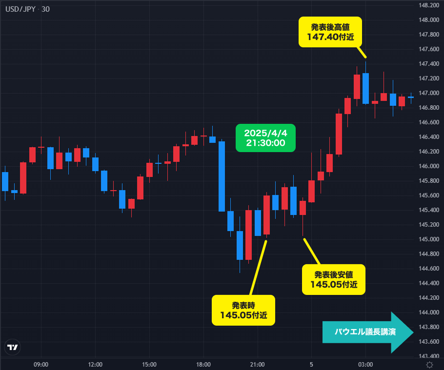 直前の4月3日(木)に米国のトランプ大統領が相互関税について発表し、波乱の相場展開の中で迎えた4月4日(金)発表の米国雇用統計(3月)では、非農業部門雇用者数が22.8万人増と市場予想を大きく上回る結果となり、失業率は4.2%と前月比で鈍化したものの、トランプ関税の影響を受ける前の労働市場の堅調さを裏付ける内容となった。これを受け、発表直後のUSD/JPYは145円50銭付近まで円安が進行。一時は再び145円付近まで値を戻すも、FRBパウエル議長の講演における「(米国の利下げは)状況が明確になるまで様子を見る」という主旨の発言が報じられると、再度円売りが優勢に。USD/JPYは、146円台後半で当日の取引を終えた。
