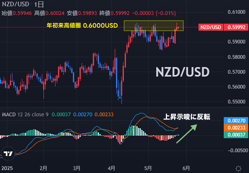 年初来高値圏で推移しているNZD/USD。昨日は一時1NZD=0.6030USD台まで上昇して年初来高値を更新しているが、特段NZD買いの要因は見当たらず、トランプ大統領の関税政策を嫌気した米国離れによるUSD売りがNZD/USD上昇の背景にある模様。MACD※で相場状況を確認すると、下落を示唆する局面で底堅く推移した後、上昇示唆に転換したばかりであることから、暫くNZD買い/USD売りの流れが続く可能性も。