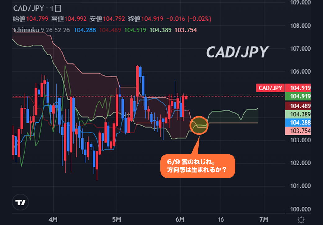 CAD/JPYのテクニカルポイントでは、一目均衡表において相場が動きやすい傾向にある雲のねじれを6/9(月)に迎えることから、今週CADの一連のイベントを受けて短期的なトレンドが発生した場合は、その方向に合わせた順張りが一つのトレーディング・アイディアになるかも知れない。