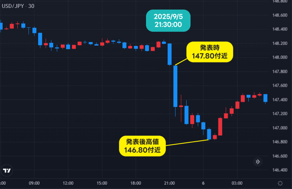 雇用の鈍化を示す?前月に続き、米ドル円は発表後下落