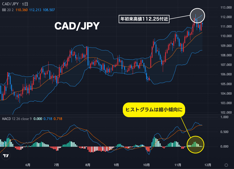 CAD/JPYは、10月以降の強い上昇トレンドを継続し、足元では一時112円を回復する高値圏での推移。テクニカル的には、ボリンジャーバンド※1の上限付近での値動きが続いており、買いトレンドは継続中との見方も。一方、MACD※2を確認すると、2つのラインは上昇基調を維持しているものの、ヒストグラムは徐々に縮小傾向にあり、相場の勢いはピークアウト感が出始めている可能性も。短期的には、調整局面や利食い売りに注意する局面に差し掛かっているか。