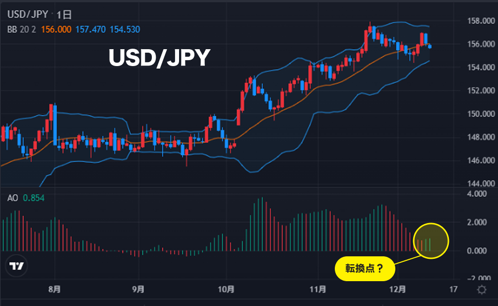 USD/JPYは短期的な調整を経て、直近ではボリンジャーバンド※1のセンターラインである156円を挟んでの値動き。バンドはやや収縮傾向にあり、エネルギーを溜めて、次の短期的な方向感を探る状況か。下段のオーサムオシレーター※2を確認すると、足元では下落トレンド(赤)から上昇トレンド(緑)への転換を示唆しており、こちらの側面からは、やや上昇のモメンタムが強いとの見方もできる。ここから再びトレンドが強まるか注目。