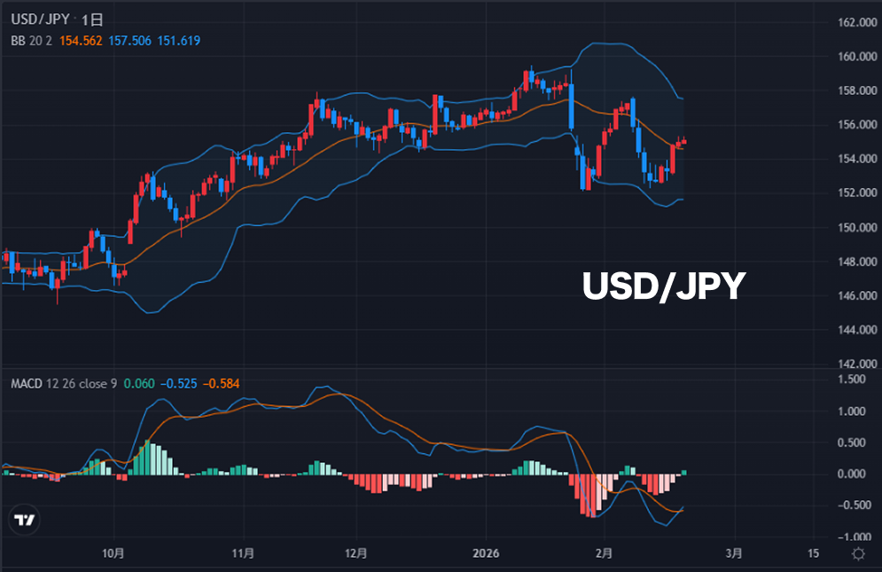 USD/JPYは2月中旬の急落後に買い戻しが入り、足元ではボリンジャーバンド※1のセンターライン(20日線)付近での攻防が続いている。いったんは下落の勢いが和らいだものの、明確にセンターラインを上抜ける動きには至っておらず、方向感を探る局面。今後、センターラインを明確に上抜ければ地合い改善、抑えられれば再び下方向を試す可能性も意識される展開か。下段のMACD※2ではヒストグラムが赤から緑へと転換し、下落モメンタムの減速は確認できる一方で、MACD本体はまだゼロラインの下にあり、中期トレンドの回復にはもう一段の上昇が必要とも言えそう。